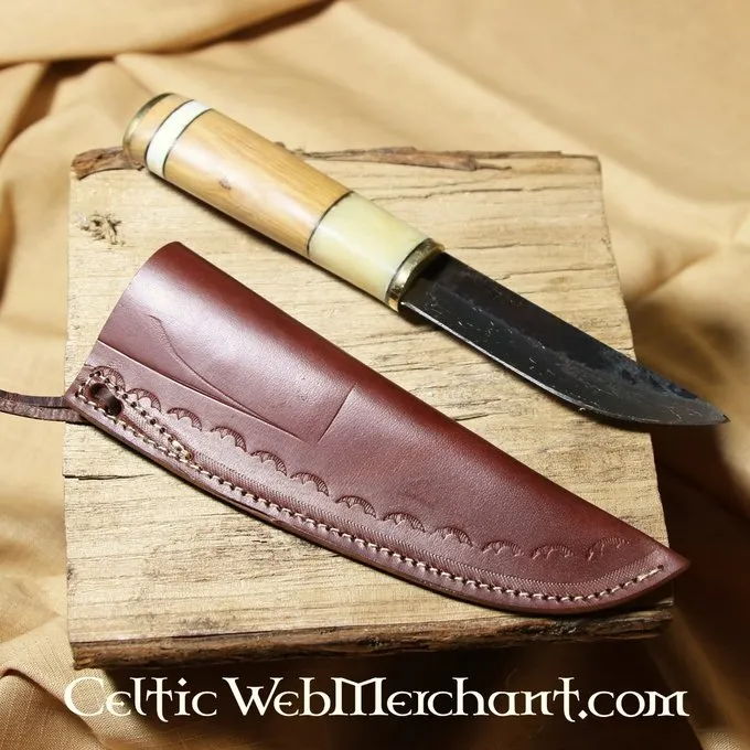 De tels couteaux ont été utilisés au début du Moyen Âge, par exemple par les Mérovingiens, les Anglo-Saxons et les Vikings. Un couteau utilitaire pratique était indispensable pour les travaux quotidiens. Ce couteau a une lame forgée à la main et une poignée de décorations en os, bois et laiton. Il est livré avec une gaine en cuir marron avec un motif décoratif. Au final, c’est un couteau avec de beaux détails et un atout pour tout viking, germanique, anglo-sax ou franc.