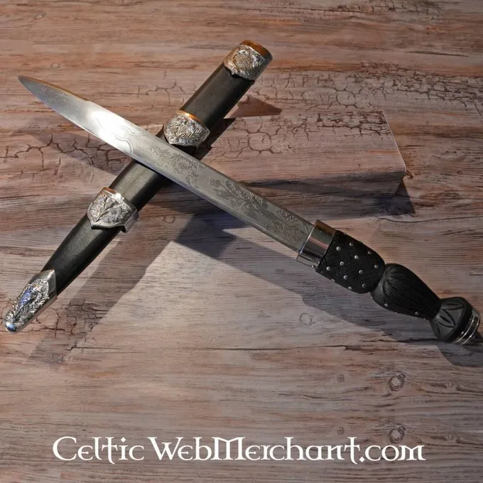 Dirk est un mot écossais pour long poignard. Dagues de ce genre ont été principalement utilisés par l’armée écossaise après la bataille de Culloden. Le poignard est entièrement fait main et possède un manche en bois qui est recouvert de cuir. Le poignard a une gravure de l’emblème national écossais, le chardon. Le poignard a une longueur de 45 cm et une lame de 29 cm.