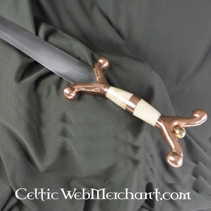 Cette épée a une lame d’acier, la poignée est faite d’os et de bronze. La poignée est faite dans une forme anthropomorphique stylisée. L’épée a une longueur d’env. 66 cm et il pèse 1 kg.