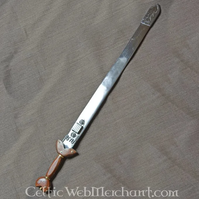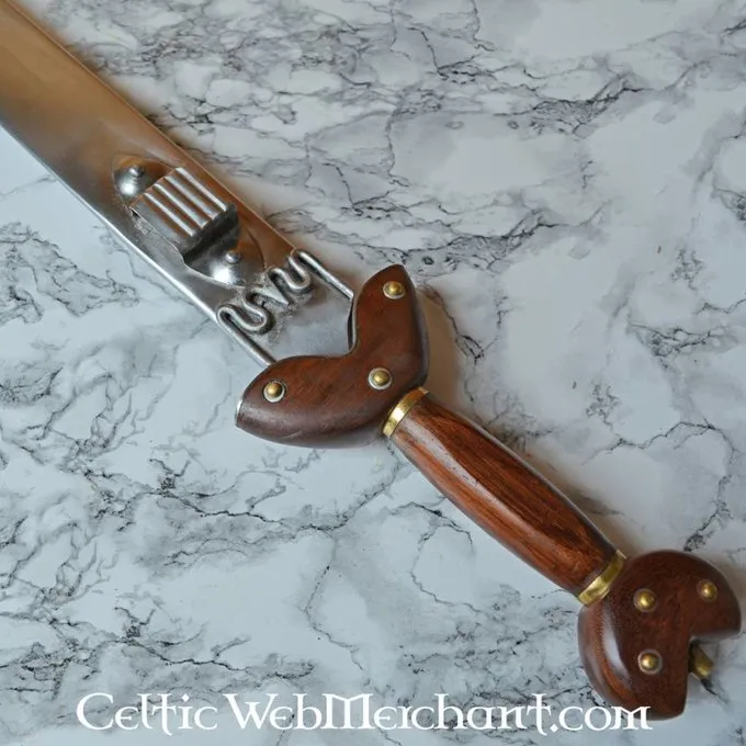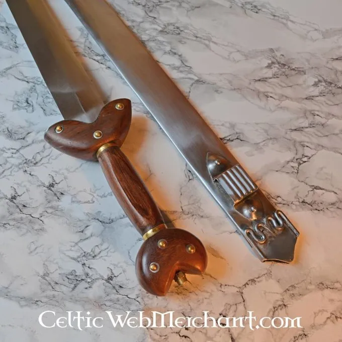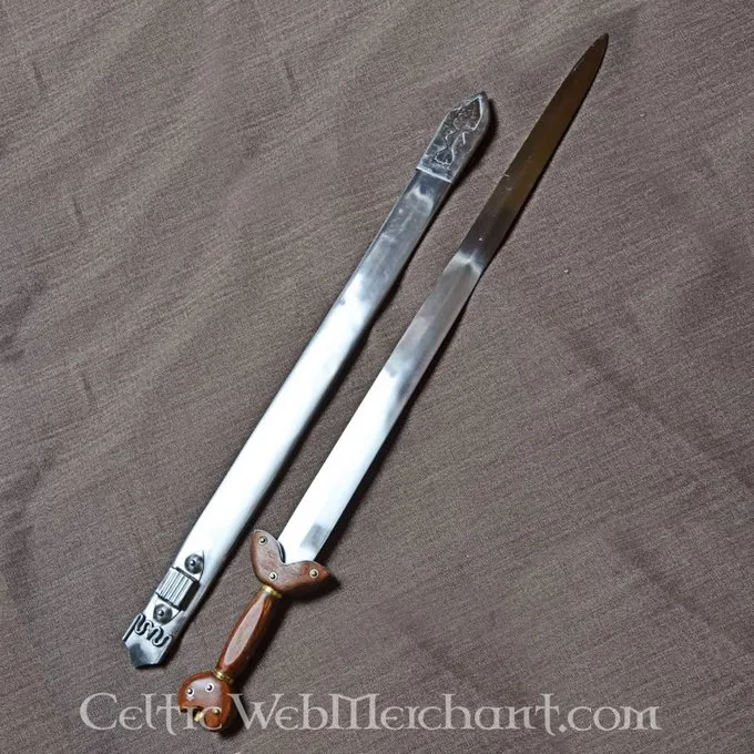 La poignée est en bois. L’épée est livrée avec un fourreau en fer orné d’ornements dans le style artistique de La Tène.