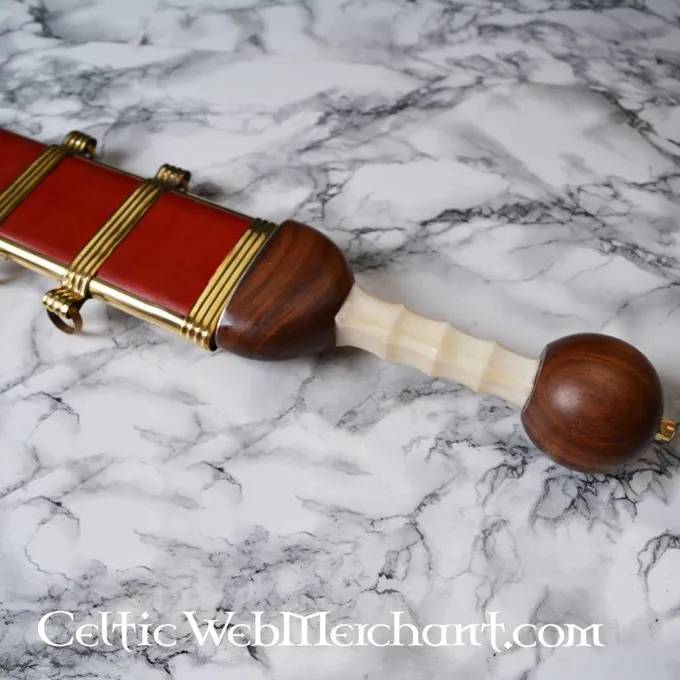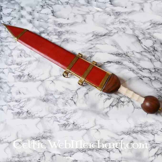 Ce gladius est une réplique d’un original du 1er siècle après JC. Ce roman gladius a une pomme de type Pompéi (nommé d’après un original fouillé dans la ville historique de Pompéi). La poignée est en bois et en os. La poignée est constituée d’acier au carbone EN45. Des gladiides comme ceux-ci ont été utilisés jusqu’au 3ème siècle après JC et c’est le type le plus fréquent de gladius.