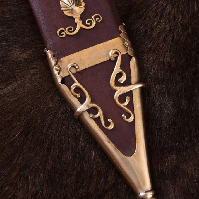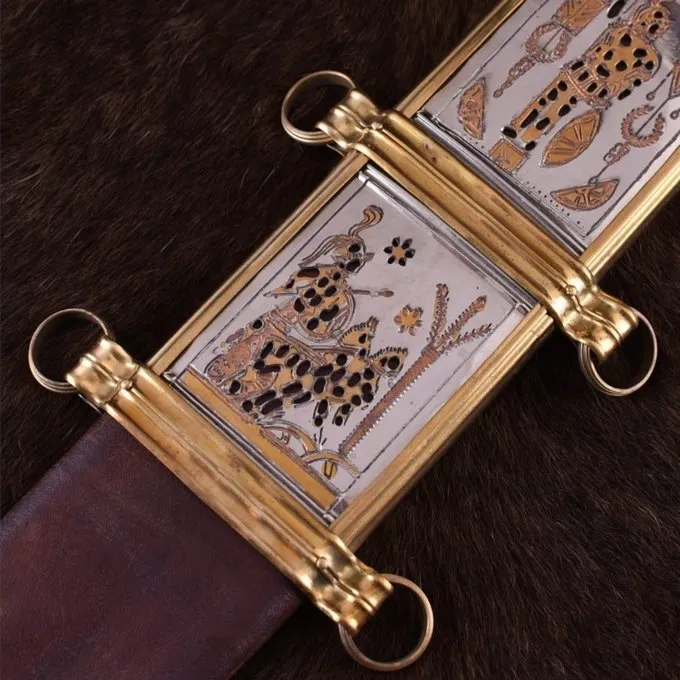 Ce gladius de luxe est un atout pour les collectionneurs d’armes classiques et reconstitueurs romains. Il a une lame d’acier FR45 et une poignée d’os et de bois avec un pommeau vissé. Il est livrée avec un fourreau en cuir avec un noyau en bois. Le fourreau est joliment décoré avec des raccords en laiton. Les deux carrés montrent l’iconographie de la guerre et la victoire. Le fond carré montre une figure bien armée sur un char. La place du haut montre une figure complètement armé entouré de l’iconographie victorieuse, comme lauriers. La partie inférieure est décorative, avec une palmette et une pointe scabbard décorée. Le fourreau a des anneaux en laiton de sorte que vous pouvez l’accrocher à votre ceinture.