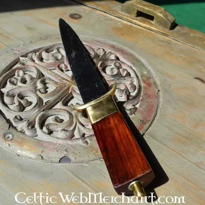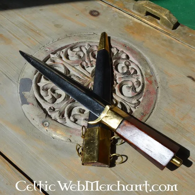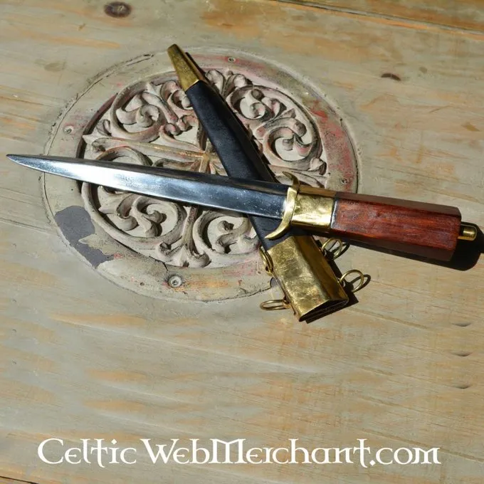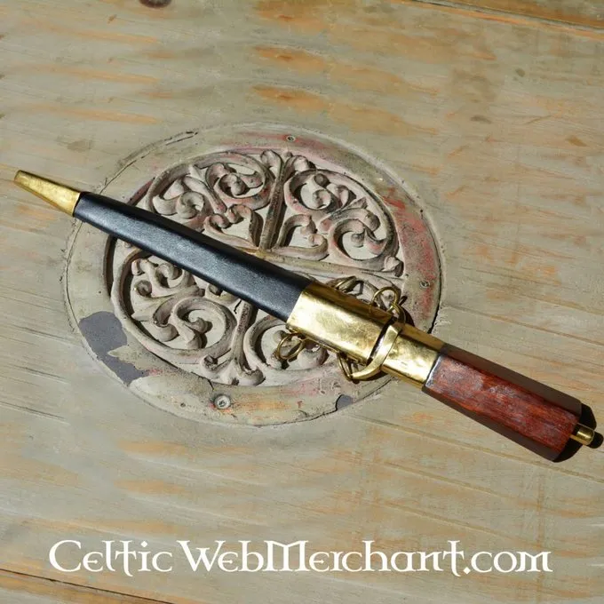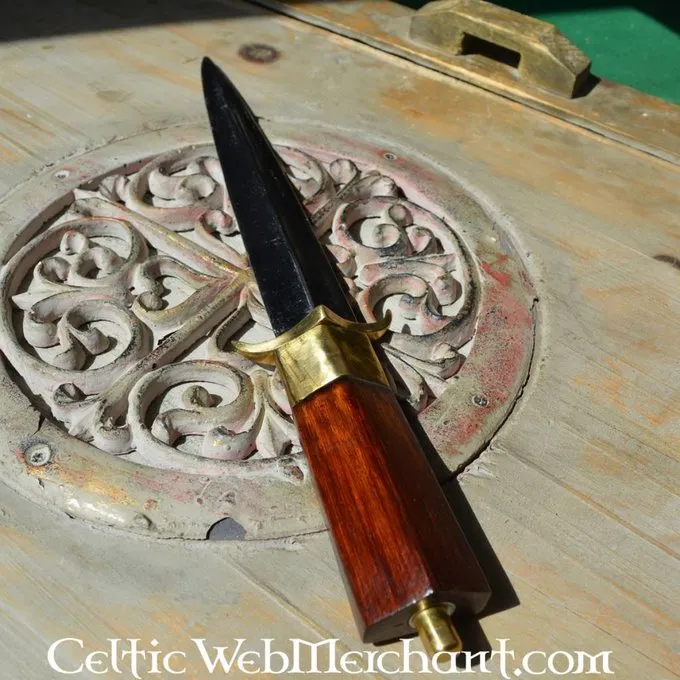 Cette réplique a une lame triangulaire. Le manche est en bois recouvert de cuir. Tant le fourreau et le poignard ont pièces en laiton. Le poignard sa longueur est de 33 cm et il a une longueur de lame de 19 cm.