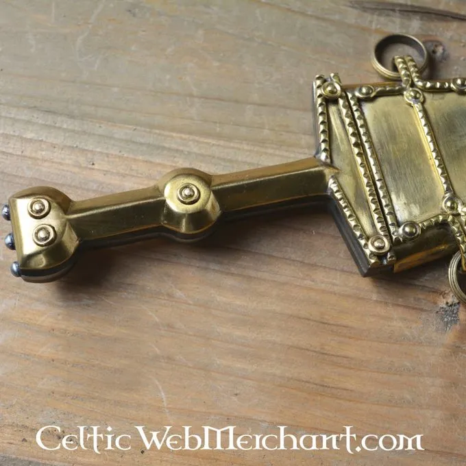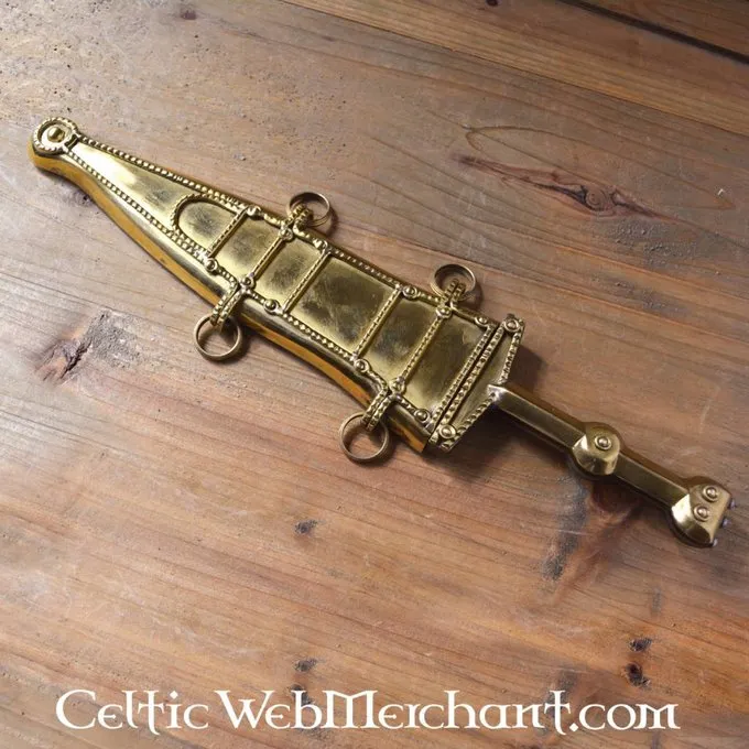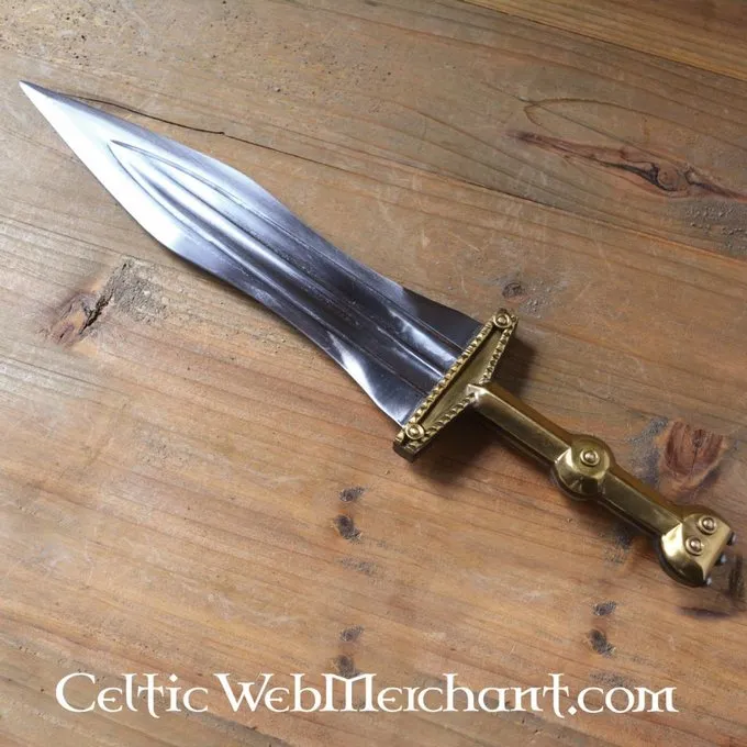 Détails de produit: Longueur: 37.5 cm / Longueur de lame: 25 cm / Longueur de poignée: 12.5 cm / Poids: 350 g / Type d’acier de la lame: EN45 carbon steel / Tranchant: semi-sharp / Soie: full tang construction / Poignée: brass / Basé sur un original histo