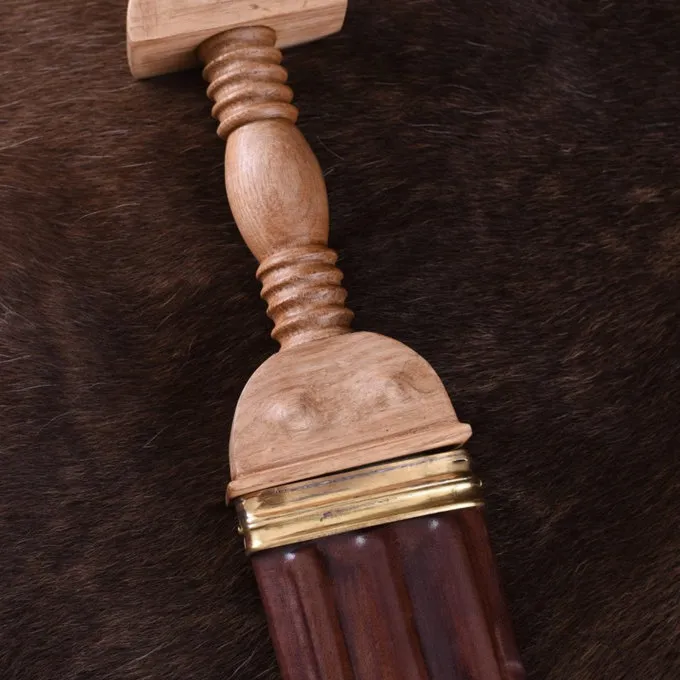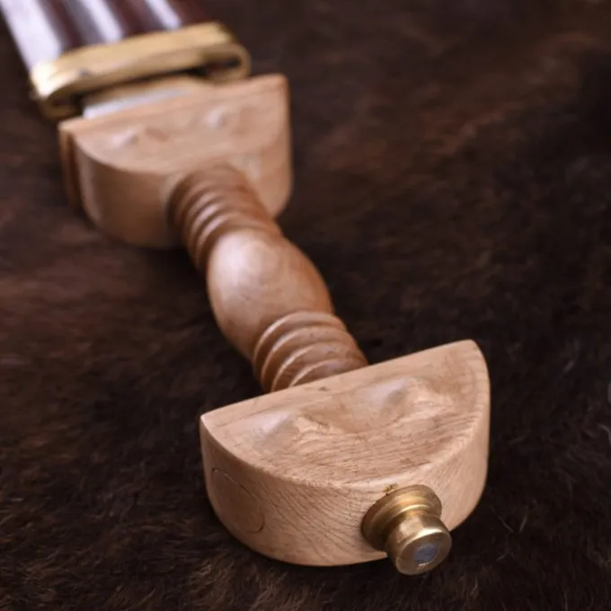 Ce spatha n’est pas une réplique exacte de 1 pièce de musée particulier, mais il est basé sur les restes originaux de plusieurs Spathas du IIe siècle après JC. qui sont exposées dans le musée Limes à Aalen, Allemagne. A partir de la fin du deuxième siècle, le spatha a commencé à gagner en popularité parmi les légionnaires romains et auxiliae, au détriment de la gladius. Le spatha était beaucoup plus long que le gladius, il était aussi parfait pour les troupes de cavalerie. L’infanterie a porté le spatha sur le côté droit et la cavalerie porta sur le côté gauche. Ce spatha a une belle poignée en bois et un pommeau vissé. Il est livrée avec un fourreau en cuir avec un noyau en bois. Le fourreau a une belle boucle de ceinture de laiton (pour les ceintures jusqu’à 5,5 cm de large) et des raccords en laiton sur le haut et le bas.