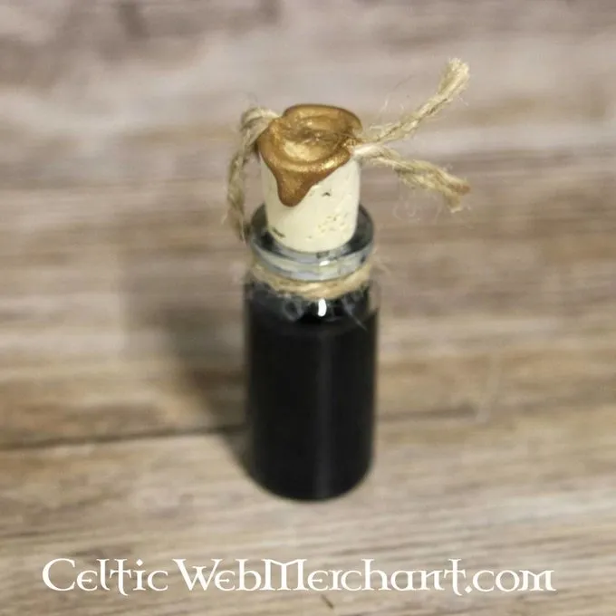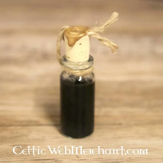 Cette encre est faite en utilisant une recette originale, à partir de la galle, de la gomme arabique et du sulfate de fer. Les recettes de l’encre étaient un secret bien gardé à l’époque antique et médiévale, mais il est possible de les reconstruire. Cette encre est faite avec une recette du 3ème siècle avant JC. L’encre est brune lorsque vous la mettez sur du papier ou du papyrus, mais elle devient noire lorsqu’elle est complètement séchée. Une bouteille en verre contient 10 ml. La bouteille est fermée avec un bouchon et un sceau, montrant le dieu Mercure.