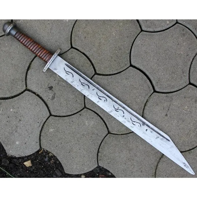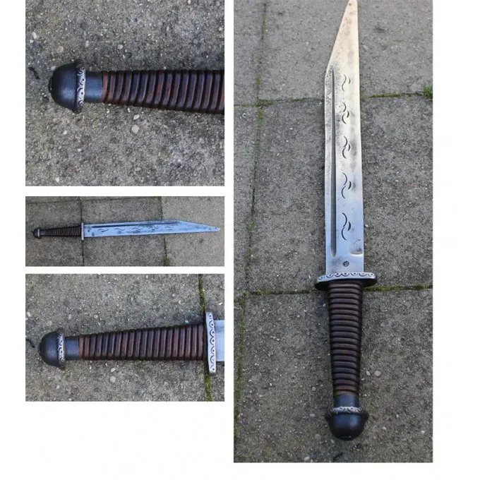 Ce seax a une longueur de 69 cm avec une lame de 51 cm et il pèse 1100 g. Son pommeau et sa traverse sont gravés. Le Seax est en acier 54SiCr6 avec une dureté Rockwell de HRC 54 ? 56. Le pommeau et la traverse sont en acier.