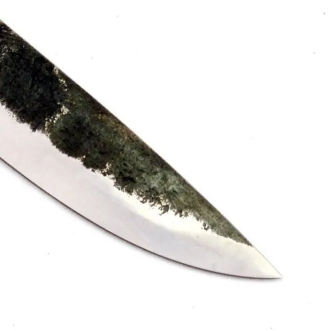 Cette lame de couteau forgé à la main est une réplique de plusieurs originaux au début du Moyen Age. Lames de couteaux comme celui-ci ont été utilisés dans toute l’Europe entre les 8e et 11e siècles. Il est fait de l’acier au carbone 1085 et trempée à une dureté de 54-56 HRC.