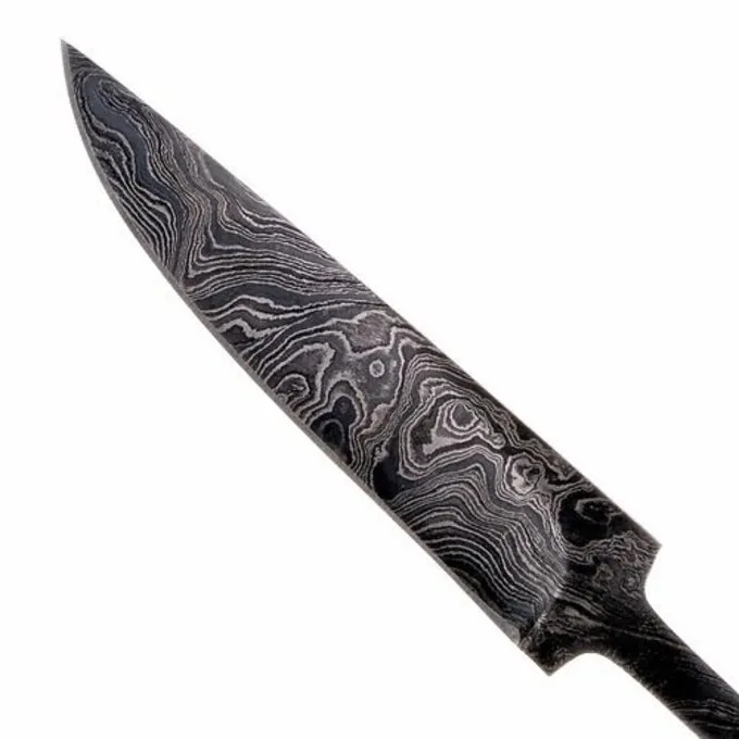 Cette lame de couteau à la main est composée de 176 couches d’acier damas. Il est fabriqué en acier des types AISI 4340 et 15N20 et est trempé à une dureté de 56-58 HRC.