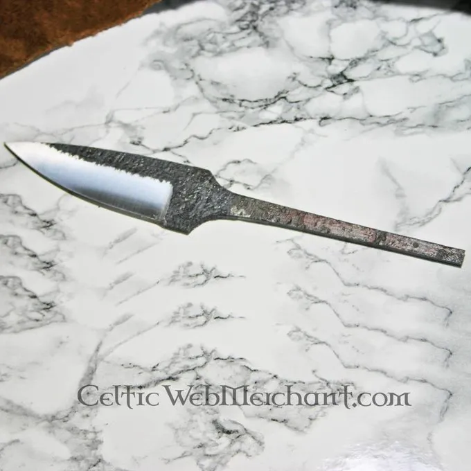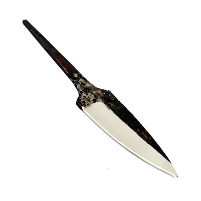 Cette lame est faite à la main en acier carbone. Sa dureté est de 54 HRC, elle a une longueur de 18 cm et une largeur maximale de 3 cm. Elle a un bord tranchant et le dos de la lame a une épaisseur de 0,3 cm.