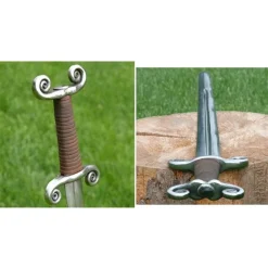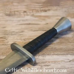 Ce gladius est basé sur des gladicides du type Mainz, utilisés par l’armée romaine jusqu’au 3ème-4ème siècle. Ce type avait une lame et une poignée plus larges que le populaire Pompéi type gladius. Ce gladius a une poignée en bois, ornée d’anneaux en laiton. Il est livré avec un fourreau en bois, recouvert de cuir et décoré de laiton. Le fourreau a deux anneaux avec lesquels il peut être attaché à la ceinture.