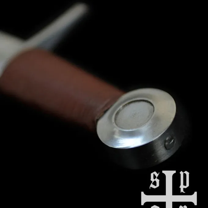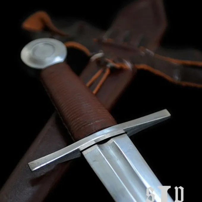 Poignards étaient très populaires au Moyen-Age. Le poignard était une arme largement utilisée par les chevaliers, archers, lanciers, fantassins, etc. En plus de leur arme la plus importante, comme l’arc, le poignard était important pour un sur un combat et d’autodéfense. Le poignard a été porté à la ceinture afin qu’il puisse être saisi rapidement dans des situations d’urgence. Ce poignard est basé sur les originaux haut Moyen Age. Il a une poignée en cuir marron avec un noyau en bois, une pleine saveur et un pommeau riveté. La garde roue et arçons droite sont complètement dans le style du Haut Moyen Age. Le poignard est livrée avec un fourreau très luxueux en cuir de haute qualité.
