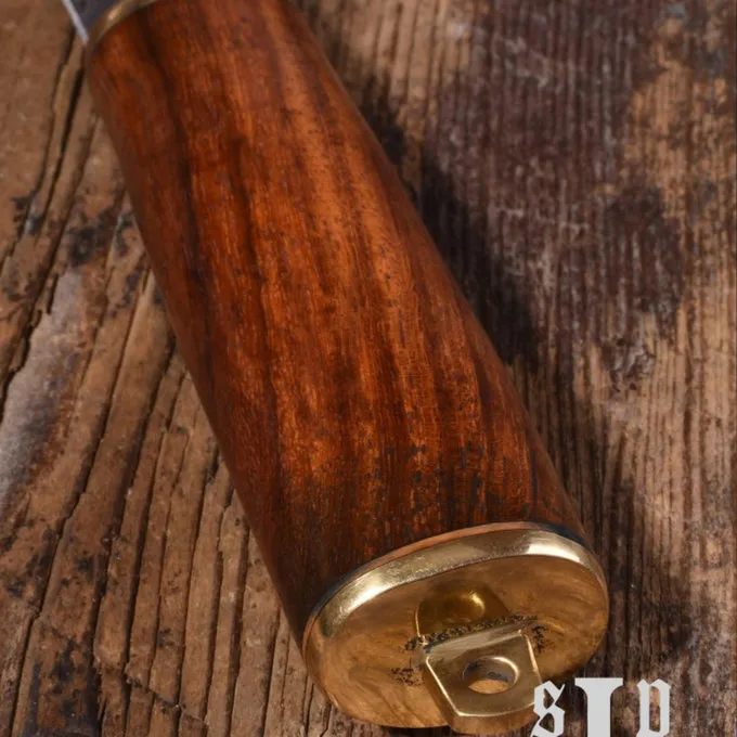 Matériel: Acier Damas (256 couches), bois, laiton, cuir