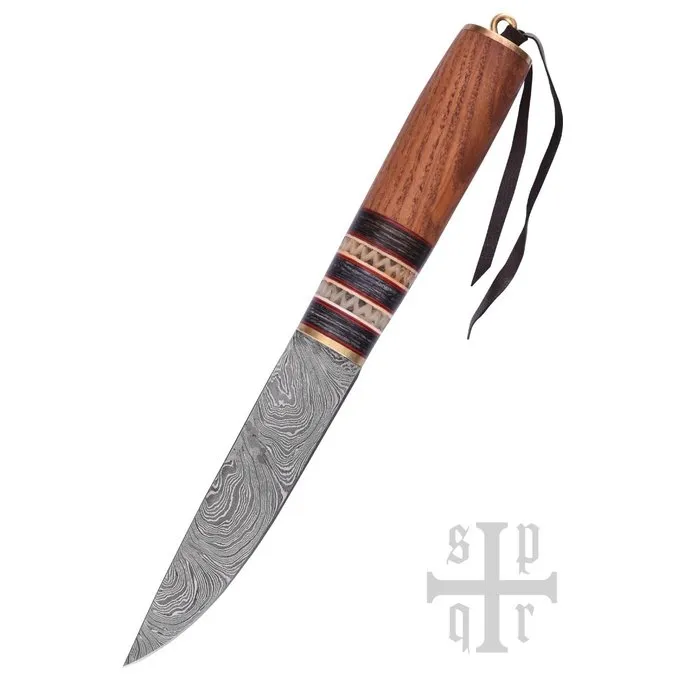 Matériel: Acier Damas (256 couches), bois, laiton, cuir, os / / Longueur: 23,5 cm / / Bord: forte (pour une utilisation pratique) / / Longueur de lame: 12 cm / / Livré avec étui en cuir / / Poids: env. 130 g (230 g incl. Fourreau) / / Basé sur un original