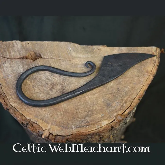 La boucle à l’extrémité de la poignée du couteau donne un aspect typique. Le couteau est forgé à la main à partir de l’acier au carbone, elle a une poignée de 6 cm et sa longueur totale est de 15 cm.