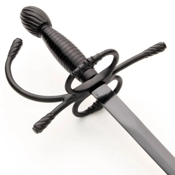 Une belle rapière par Windlass Steelcrafts basé sur des épées historiques du 17ème siècle, mais avec une touche de fantaisie. Cette rapière a été inspiré par les rapières pirates qui ont été utilisés par des pirates naviguant dans les sept mers. La poignée noire de rapière est en acier torsadé, qui rappelle la corde qu’un pirate utilise pour envahir un navire. Cette épée est livrée avec un fourreau noir avec le crâne. La lame semi-forte est forgée à partir trempé 1065 acier au carbone ayant une dureté de 48-52 HRC. Une grande épée ornementale pour le mur, aussi beau pour un costume pirate cosplay de la série et des films comme Black Sails et Pirates des Caraïbes. Lorsque vous blunten la lame, il est une grande bataille épée prête pour le combat à l’épée.