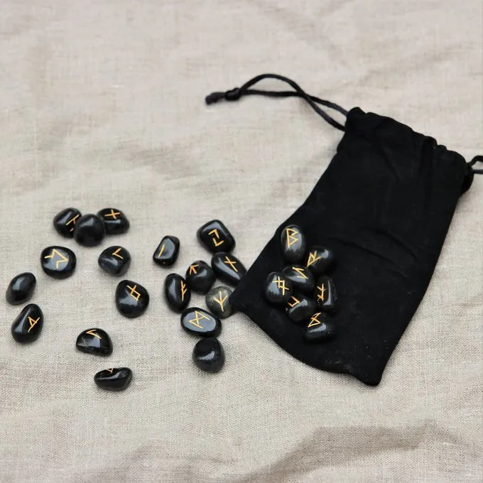 Matériel: obsidienne polie, tissu doux / Livraison: ensemble composé de 25 pierres runiques et d’un sac en tissu doux / Taille de la pierre: env. 2,54 cm / Basé sur un original historique